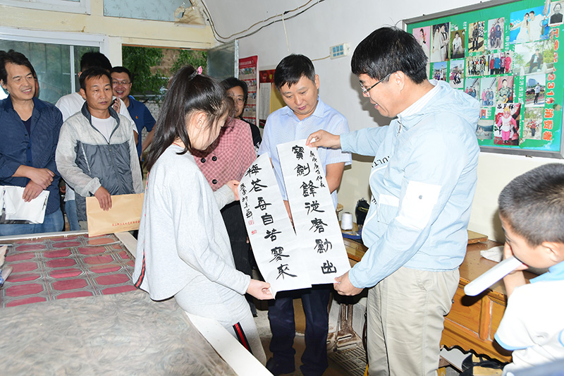 秋雨淅瀝,山間的冷風吹不散志愿者們的服務熱情。小分隊在石樓縣義牒鎮褚家峪村進行了簡短的活動啟動儀式,石樓縣委常委、宣傳部長閆建軍向志愿者們介紹了石樓縣革命老區紅色文化、群眾文藝工作特色和脫貧攻堅成果,石樓縣人大副主任、縣委辦主任宋小泉主持啟動儀式。小分隊分別向石樓縣和當地群眾贈送了書畫作品,收到作品的人們笑著合不攏嘴,紛紛拿著作品與藝術家們合影拍照。隨后,志愿者們一行在村干部的帶領下走進一戶戶村民家中,把一幅幅書法美術作品送到他們手中。從褚家峪干凈整潔、功能設備齊全的村委辦公場所和寬闊的水泥路可以看出,昔日的貧困村已經走出困境、走向脫貧致富的新生活。“來,把這幅字送給這位小朋友,這個內容送給學生很合適”盛軍邊說邊打開了一幅對聯,上書道“寶劍鋒從磨礪出,梅花香自苦寒來。”“我看了您家的墻面,這幅畫可以貼在這個位置……”馬鳳山把手中的畫作送給一位老者時說著。